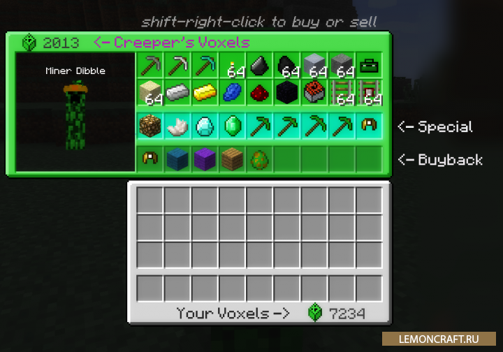Мод Voxels добавит в игру криперов-жителей, которые не будут вас атаковать, а будут заниматься торговлей. У них вы сможете приобрести различные предметы имеющие большую редкость. Кроме этого в игре появится много новых блоков и полезных механизмов.